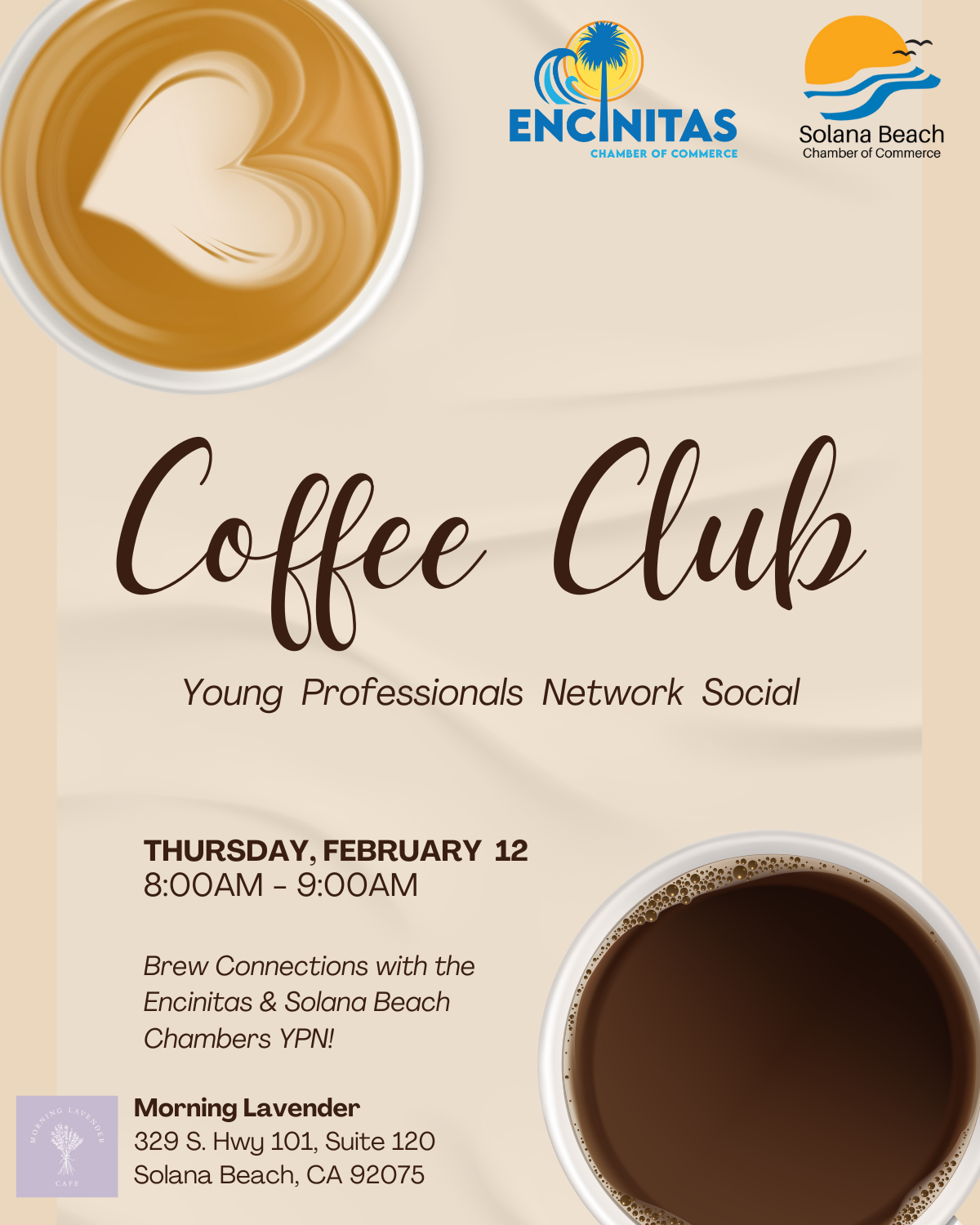 Brew Connections with the Encinitas & Solana Beach Chambers Young Professionals Network Social! This is a complimentary event and we invite attendees to show their support for our local coffee shop by making a purchase. See you there!