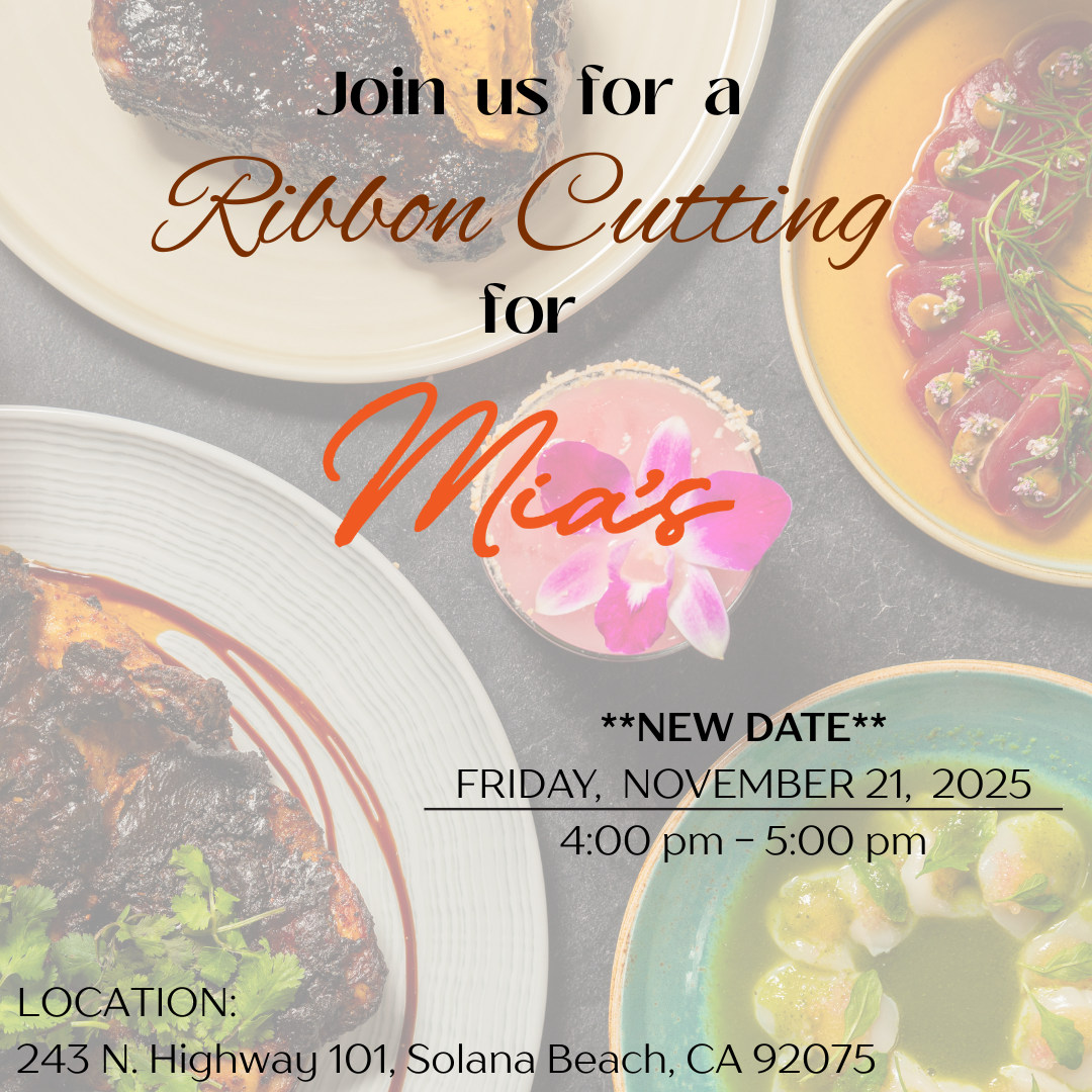 Come celebrate with us as we welcome Mia's Kitchen to Solana Beach. The Chamber will begin the ribbon cutting ceremony at 4pm.Images