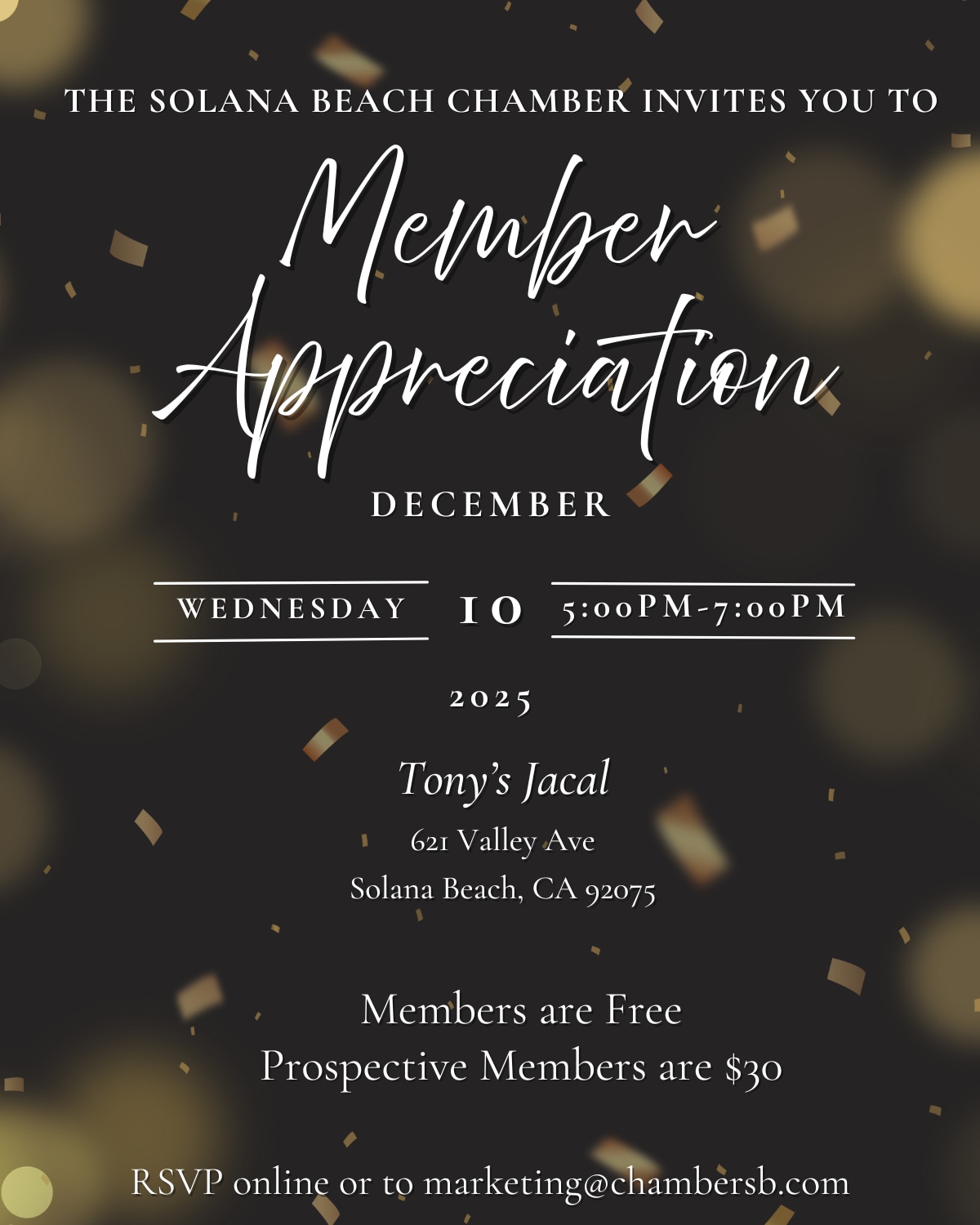 Join your fellow Solana Beach Chamber members for an evening of great company, connection, and gratitude. Enjoy complimentary small bites and one happy hour drink on us as we celebrate you; the heart of our Chamber community!