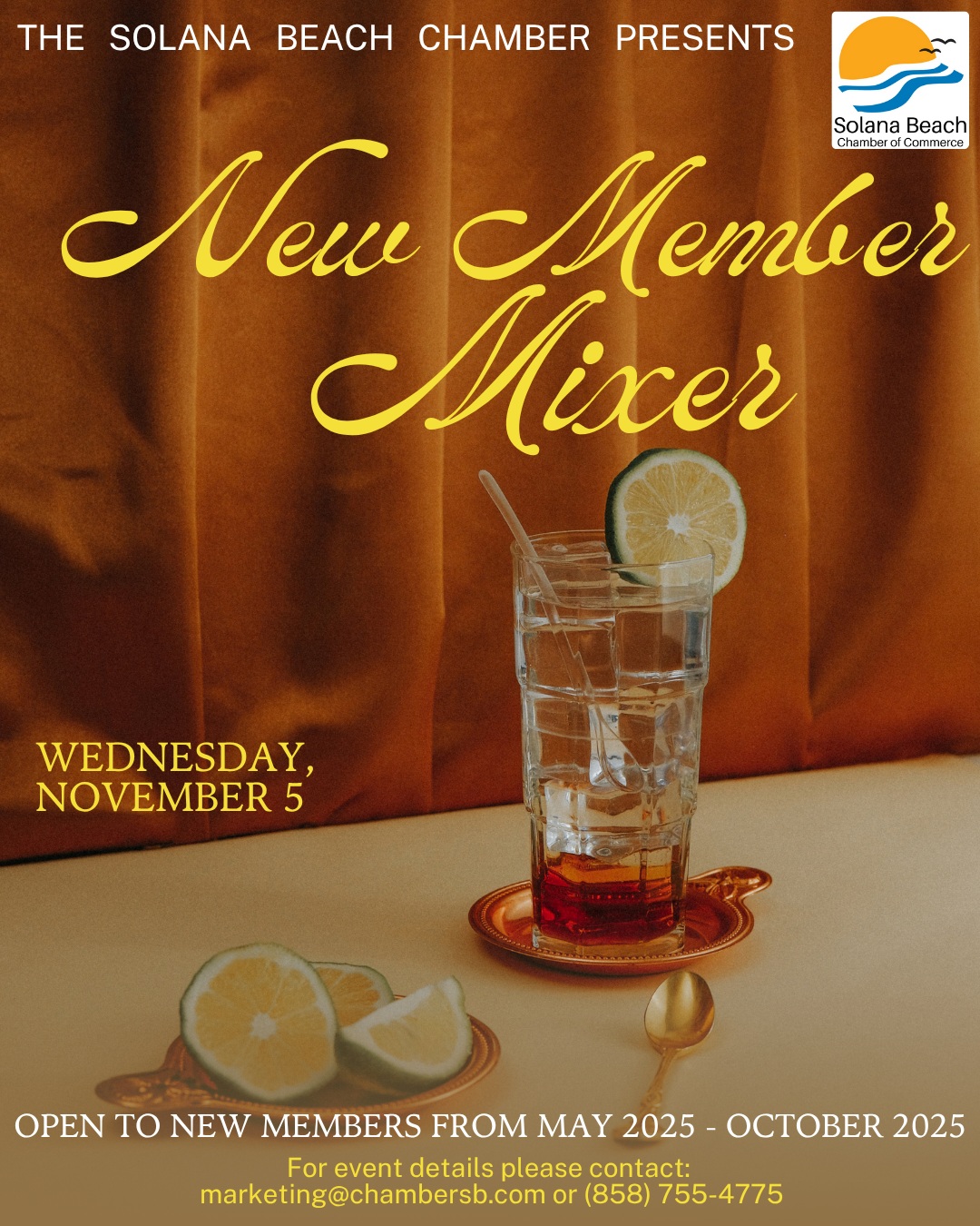 As a new member of the Solana Beach Chamber of Commerce, you’re cordially invited to our New Member Mixer—an exclusive opportunity to connect with fellow business professionals!