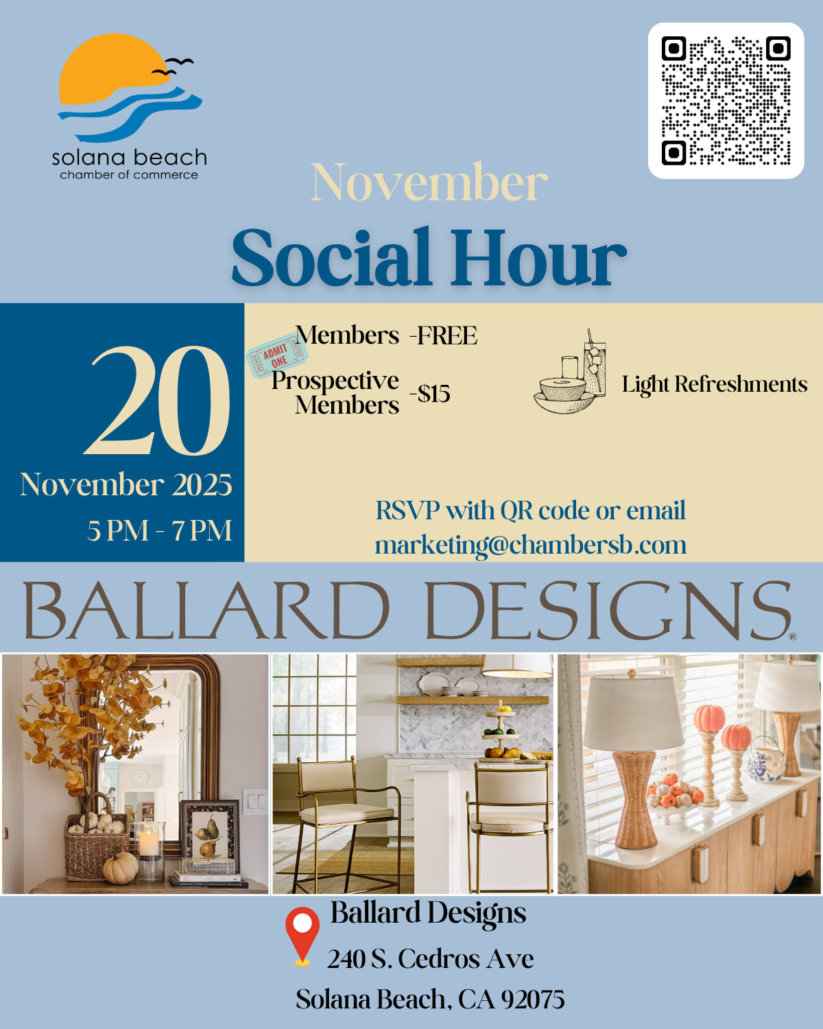 Join us for a relaxing evening at Ballard Designs off Cedros Ave! Mingle with fellow Chamber members and guests in a warm, inviting atmosphere surrounded by inspiring design and style. Enjoy complimentary light bites and refreshments. Be sure to bring your business cards! RSVP is required; please no walk-ins. We can’t wait to connect with you!Images