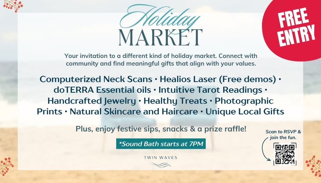 Welcome to the Holiday Wellness Market at Twin Waves Wellness Center. This isn't just another market. It's a festive, nurturing space designed for you to recharge while you shop.