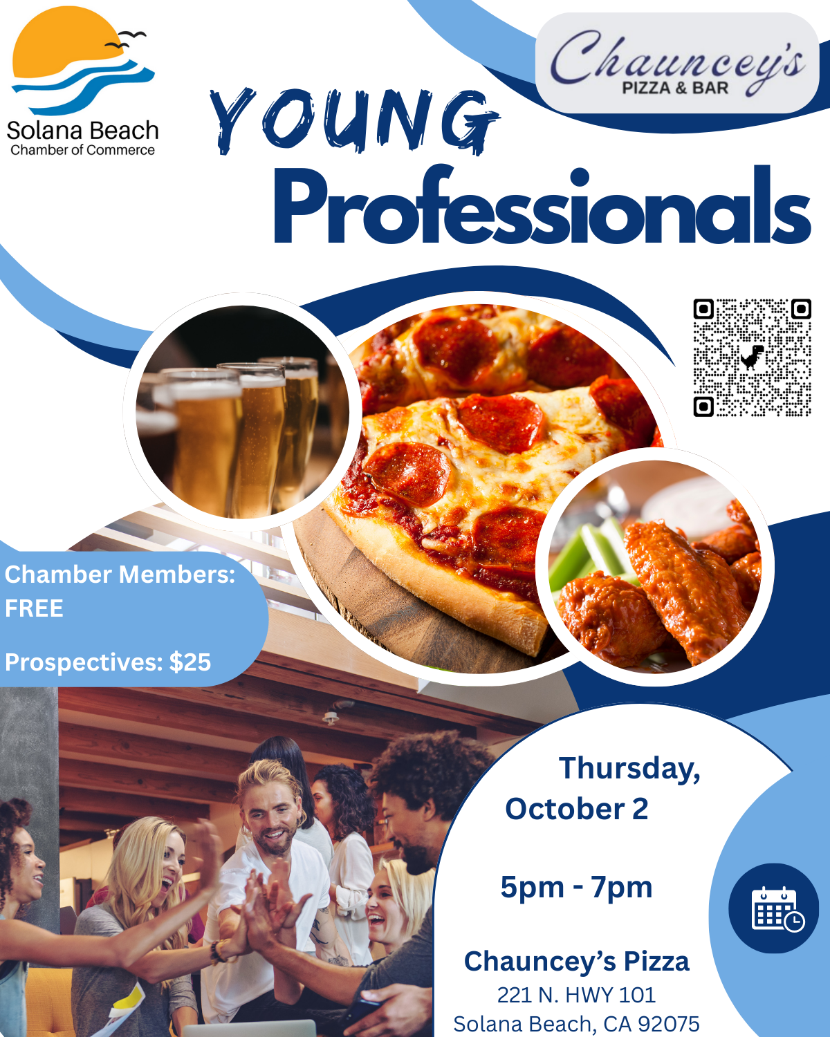 Calling all Young Professionals! It’s time to mix, mingle, and make some spooky-good connections at our next networking happy hour at Chauncey's Pizza & Bar! 📍 Where: Chauncey’s Pizza & Bar (221 N. HWY 101, Solana Beach, 92075) 📅 When: Thursday, October 2 🕔 Time: 5:00 PM – 7:00 PM What’s Brewing: -Tasty appetizers -One complimentary drink -Chill convos with fellow young members & prospects -Halloween Trivia We kindly ask our awesome young folks to RSVP in advance; please no walk-ins. Let’s make this a night to remember. We can’t wait to see you there!Images